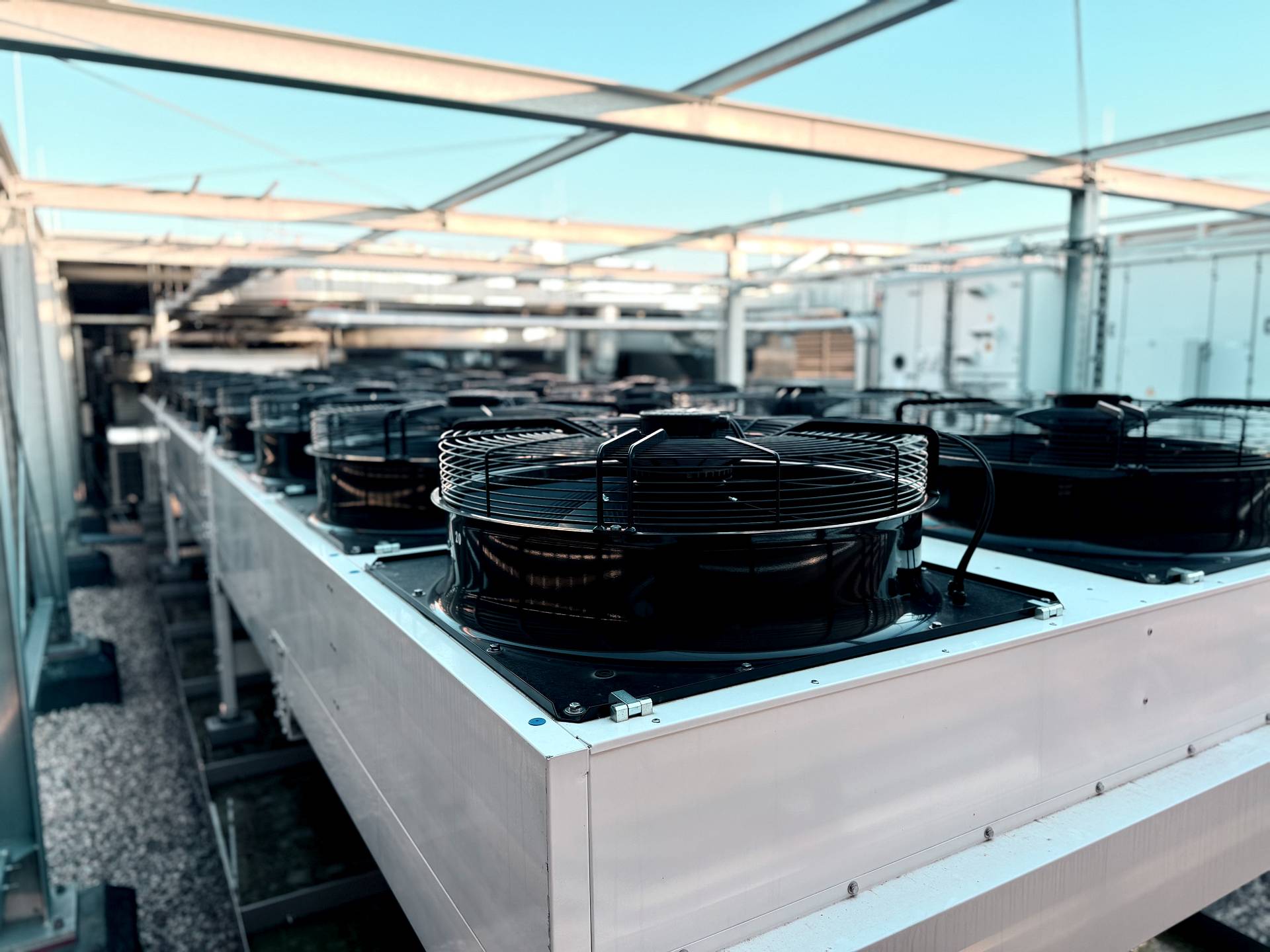 - Industriekältemaschine mit Propan R290 für die Kühlung der gesamten Fabrik auf verschiedenen Niveaus inkl. Prozesskälte (2°C), Kühlzellen (7°C), Kühlung RLT Geräte (6°C /12°C), Funktionalboden (16°C) in redundanter Ausfertigung der Maschine mit 4 unabhängigen Kältekreisen